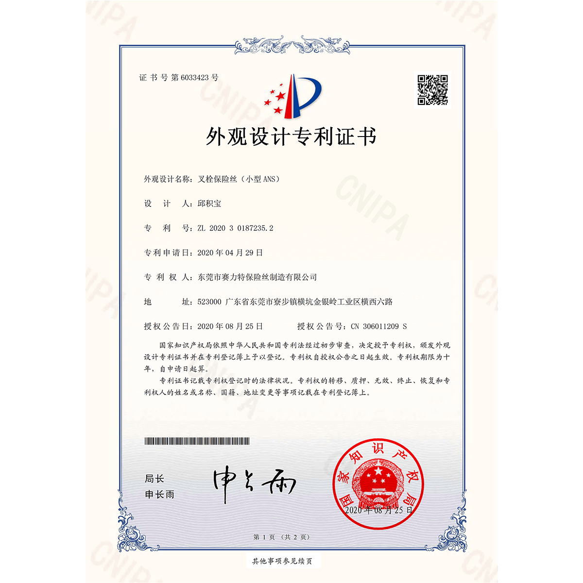 我司已于2020年8月25日取得ANS及ANS-S小号叉栓保险丝的外观设计专利证书。
