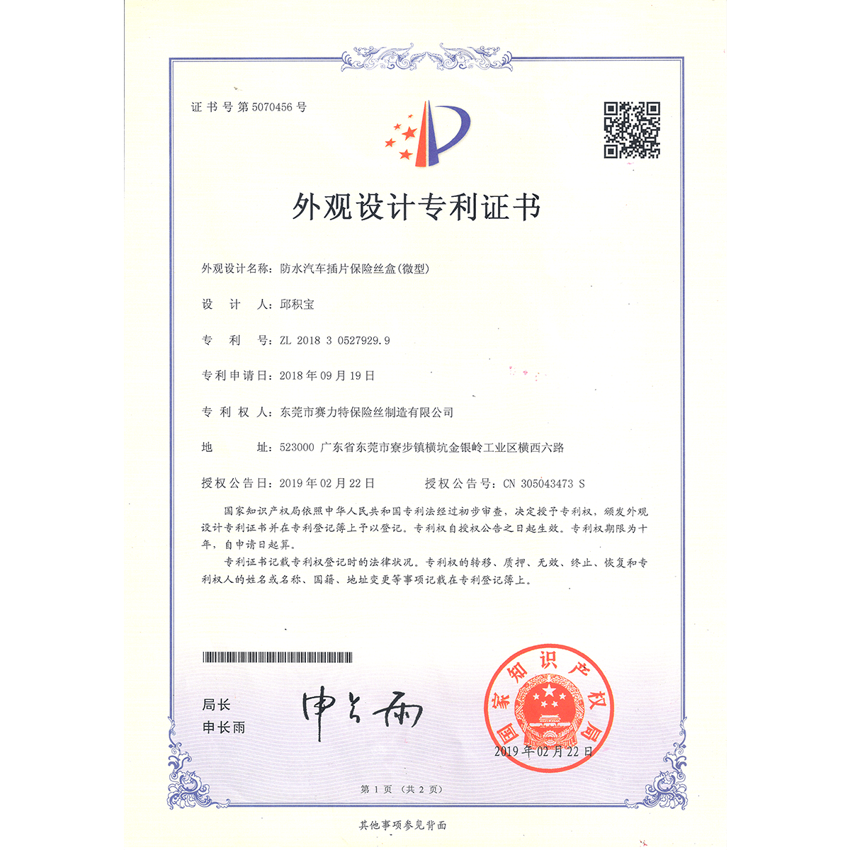 我司已于2019年2月22日取得SL-709AT迷你防水保险丝座的外观设计专利证书。